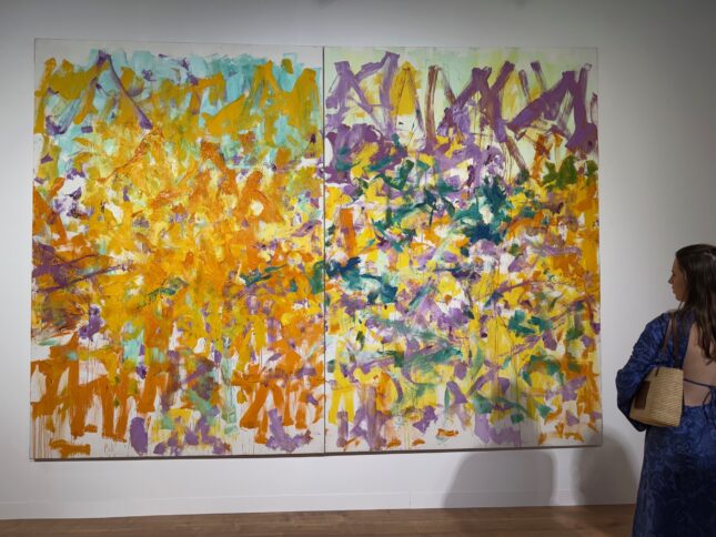One of the most impressive paintings at the fair is a diptych by another woman, the illustrious abstract expressionist painter Joan Mitchell (1925–1992), shown on the stand of the Richard Gray Gallery from Chicago. Measuring 3.6 metres across, it depicts, in a tangle of golden yellows and violets, what could be a field of sunflowers. The work is for sale at 18.5 million dollars, one of the highest sums at ABMB 2025. Joan Mitchell was the subject of a successful exhibition at the Fondation Louis Vuitton, in dialogue with Claude Monet, in 2022.