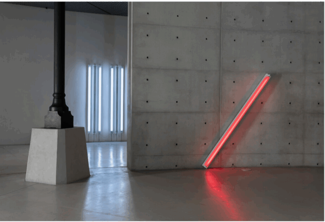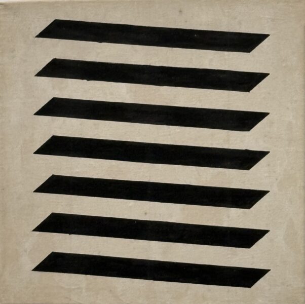 It is in the basement, with four historical works by Dan Flavin, that one most strongly feels the original presence of the Minimal spirit. These colored neon assemblages, such as The Diagonal (1963) — a single industrial neon tube mounted diagonally, which he called a “diagonal of personal ecstasy” — mark the intellectual core of the exhibition. Several rooms are devoted to specific themes. The grid, for instance, appears throughout this time-and-space journey. The great minimalist and conceptual genius Sol LeWitt (1928–2007) – here represented only by one work- made it a recurring motif: the result of rational, repetitive instructions filling the paper with fine geometric lines. “The idea,” he said, “becomes a machine that makes the art.