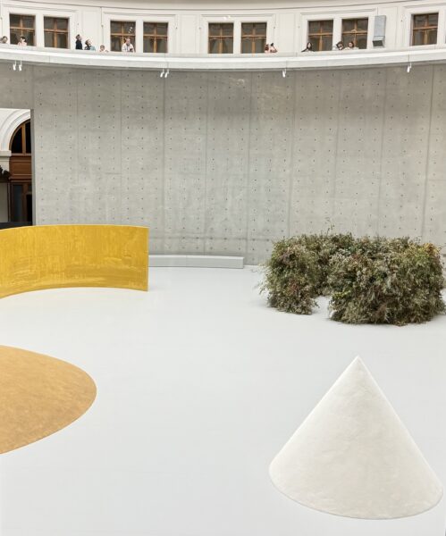 In this spirit of freedom, the majestic rotunda of the Bourse de Commerce is occupied by the American artist Meg Webster (born 1944). “Her work is a fascinating continuation of geometric exploration, but always conceived in natural materials — earth, salt, beeswax, foliage…” Webster has drawn in three dimensions a schematic, colorful landscape composed of five monumental simple forms — dome, cylinders, concave wall — symbolizing ecological concerns.