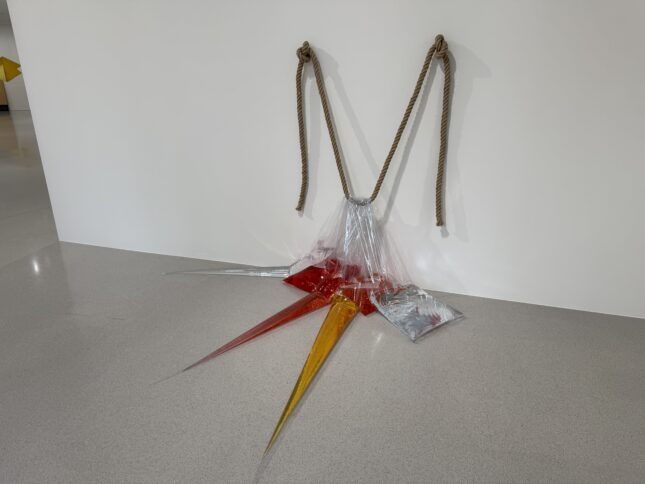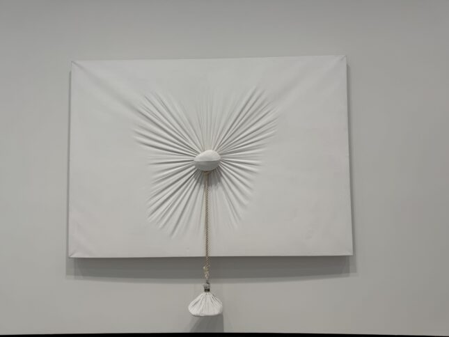In 1968, the German artist Gunther Uecker (1930–2025), part of the Zero movement — which sought to start again from zero after the war — arranged nails on a monochrome surface to form a grid. One of the most beautiful spaces in the exhibition is devoted to a 2003 piece by Brazilian artist Lygia Pape (1927–2004), a member of the Neo-Concrete movement. Here she imagined immense golden metal threads stretched through the darkness, like the materialization of streams of light illuminating invisible stars — minimal for maximal effect.
