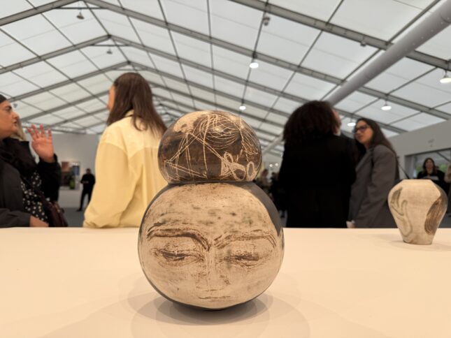 At Frieze London, Modern Art is located at the fair’s entrance, showing the ceramic work of an astonishing figurative painter, Sanya Kantarovsky (born 1982 in Moscow, based in New York). His vases and plates, decorated with highly expressive—indeed expressionist—figures distorted by emotion (priced between $15,000 and $45,000), all sold on the opening day. “In ten years, Sanya’s prices have doubled,” Shave notes. His work now belongs to the permanent collections of institutions such as LACMA in Los Angeles and Tate in London.