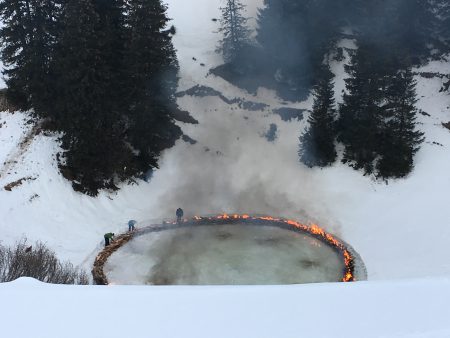 At the summit of a snow-covered mountain, in an inaccessible location behind a piste, but visible from afar, is an immense ring of fire, completely surrounded by snow. It burns while the sound of wolves, or a recording of wolves to be more precise, bay for blood.Fire is traditionally used to deter wolves. This is the mountain at its most savage…