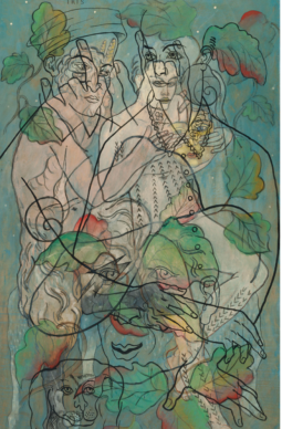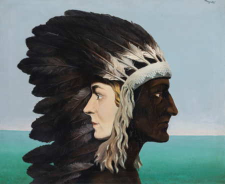 One fascinating work from the first period is “The Morning Star” («L’étoile du matin») from 1938 depicting a Native American chief in profile, his feather headdress featuring a portrait of René’s wife, Georgette. This painting, presented by Sotheby’s with an estimate of 3.9 million euros, hadn’t left the same Belgian family since 1939.