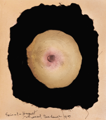 Duchamp inscribed it with a dedication to a surrealist artist, Georges Hugnet, using a play on words « Sein-t- Hugnet » (as specified in the exhibition catalogue: “the French word ‘sein’ (breast) is a homonym for ‘ceint’ (crowned) as well as for ‘saint’ (saint, holy)”).