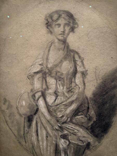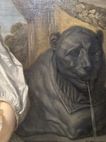 First of all because the painting is called The Broken Pitcher. The girl, who is certainly a maid, carries on her arm a pot split wide open, a bitter relic of a violent episode. Does one really need to spell out the symbolism, in the background of the painting, of a fountain in the shape of a dark grey lion—in contrast with the pastel tones of the canvas—spouting its liquid? One will also notice, right in the foreground, at the level of her pubis, the crumpled folds of the girl’s dress gathered into a ball, holding back wilted flowers. Deflowered she is.