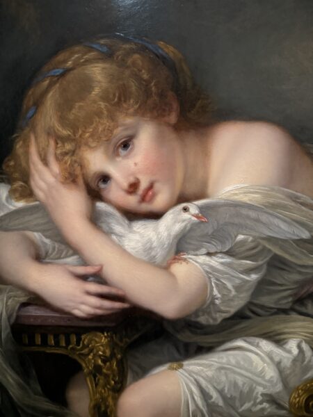 In fact, this exhibition is remarkable in that it forces us to observe the paintings with great precision. Our 21st-century eye might well be put off by the highly polished aesthetic of this immense gallery of children’s portraits. But on closer inspection, first of all the paintings are of great technical beauty, and above all Greuze gives his figures a strong psychological expression. He, who enjoyed great commercial success in his lifetime, developed his technique considerably, to the point of rendering faces with a porcelain-like delicacy. Yet none of them ever smiles. As if they had a premonition of the weight of the wounds that await them.