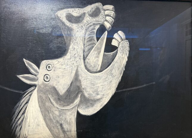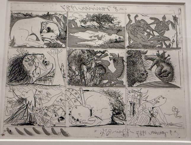 At the Musée Picasso, the narrative begins in 1937, when Pablo, mocking the dictator then in power in Spain, produced a series of etching plates entitled Songes et mensonges de Franco (Dreams and Lies of Franco), which would be shown in New York. A young American painter in the making, Philip Guston (1913–1980), saw them—just as, in 1939, he saw the famous painting Guernica, the fresco of grief over the massacre in the small Basque town, as it toured the United States. The ensemble would have a profound influence on him.
