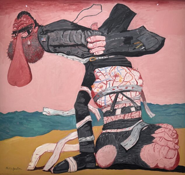 The Paris exhibition brings together 80 works that sketch, briefly but effectively, Guston’s different periods. He is first driven by a virtuoso figurative verve with humanist themes, as in his Bombardment of 1937—an extraordinary, round painting, distorted like an anamorphosis. In 1947, in New York, he enters an abstract period, that of Action Painting, alongside Pollock and de Kooning. It comes to an end in 1969 with his return to figuration.