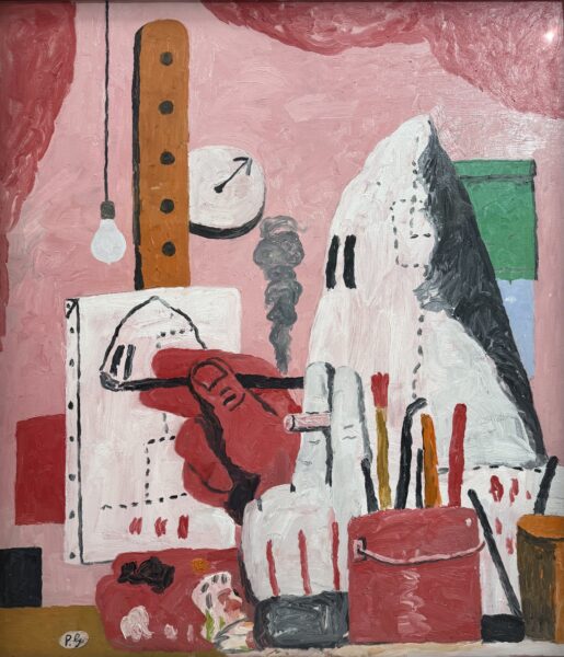 From that point on, Guston’s paintings become thunderous grimaces at American current affairs. As early as 1968, figures wearing white hoods begin to invade his canvases. These “little bastards”—a term used in the catalogue, apparently by Guston—represent the worst side of humanity. These Ku Klux Klan men, whom he chronicles across painting after painting, stand out for their ridiculousness, even when they play the role of the artist in his studio. They unfold, as always with Guston, in warped, glowing red worlds.