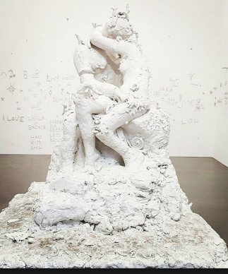 It involves an assemblage of three separate pieces in which a man and a woman, skilfully distorted, come together, draped in an actual sheet soaked in plaster.