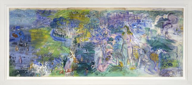The Brussels dealer David Lévy is showing a three-meter-long gouache by a famous name in modern art, known for his mastery of color as well as for his prolific output, Raoul Dufy (1877–1953). He is remembered above all for having created in 1937 the sumptuous mural hymn to light, La Fée Électricité, still visible at the Musée d’Art Moderne de la Ville de Paris. It was in that same year that he executed this study for another mural, intended for the smoking room of the Palais de Chaillot. The Course of the Seine is a vibrant composition of color contrasts that, as in the work of his contemporary Francis Picabia, plays with transparency effects to express movement (€950,000).