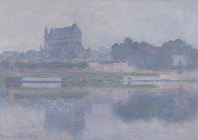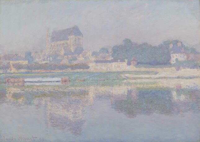 The village church, the trees, the reflections in the water are depicted in sunshine in one case and under gray skies in the other. The sensations are especially subtle. ( $20 million.)