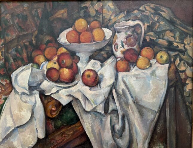 The large room devoted to still lifes demonstrates this perfectly. It is not that Cézanne was clumsy; rather, the mischievous artist has arranged apples in precarious balance. The table tilts, the white tablecloth falls in folds that should send the fruit tumbling.