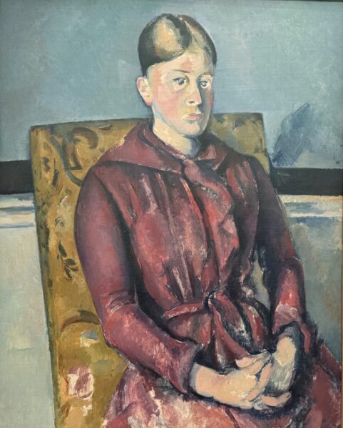 At first glance, one might be unsettled by the seemingly traditional hanging, organised thematically, from still lifes to bathers. After all, Cézanne attached only relative importance to subject matter. Take the single portrait of his wife included in the exhibition. Painted between 1888 and 1890, it speaks neither of love nor even of affection, but presents a disembodied, egg-shaped head, fixed olive-like eyes, horizontal lines suggesting the back wall, and clashing colours: a dark blood-red dress, an aged yellow armchair, and several blues across the background.