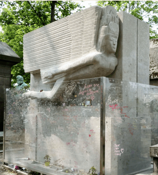 Oscar Wilde had strong ties with France, which he visited several times, including on his honeymoon. He died in Paris, and his final resting place is at Père Lachaise cemetery. Designed by the American Cubist sculptor Jacob Epstein (1880–1959), the tomb caused a scandal because of its representation of a kind of divinity known as the “Flying Demon Angel,” which includes a penis. History repeats itself. The monument mirrors the life of the writer, who enjoyed a remarkable literary apogee, married a woman with whom he had two children, before becoming, in 1895, the object of a sensational affair that led to his imprisonment for “gross indecency”—that is, homosexuality.