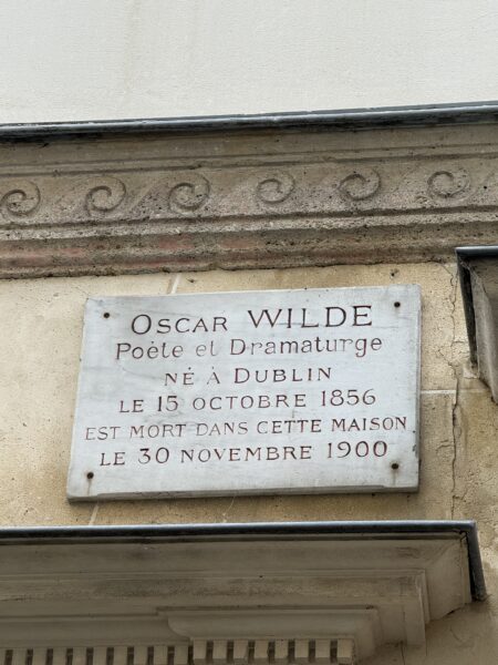 Oscar Wilde died on 30 November 1900 in his hotel room on the rue des Beaux-Arts. A plaque—bearing an error in his date of birth—still appears today on the façade of number 13. A small, very blurred photograph showing him on his deathbed, surrounded by flowers (estimate: £200), brings to a close the story of the writer, who died of meningitis at the age of forty-six.