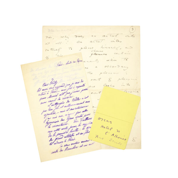 One lot expected to attract strong interest (estimate: £15,000) is a manuscript of barely one page, consisting of seventeen lines by Wilde in which he explains the role of the artist: “An artist writes entirely to please himself, and if his work charms certain artistic temperaments akin to his own, he has secondary pleasure.” According to the sale’s specialist, it was the celebrated French writer André Gide who acquired the sheet, adding a note in which he described his friend as a “great aesthete.” In 1891, following the publication of what is undoubtedly his best-known work, The Picture of Dorian Gray, Wilde spent a week in Paris. The two men met then, and Gide was fascinated by Wilde’s charisma.
