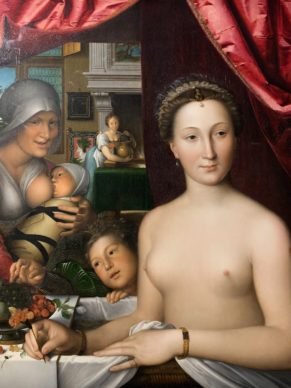 Next to her, there’s a portrait of a young blonde beauty made in the studio of Sandro Botticelli (1445-1510); her strikingly masculine face contrasting with the stream of milk flowing from her breast. This is in keeping with the idea of a grace that everyone, men and women, embodied.